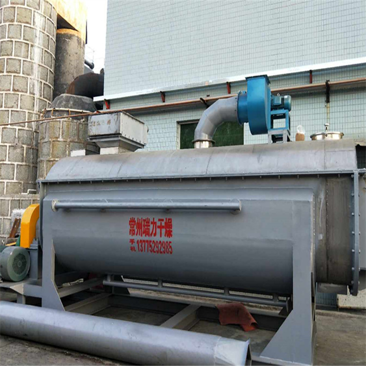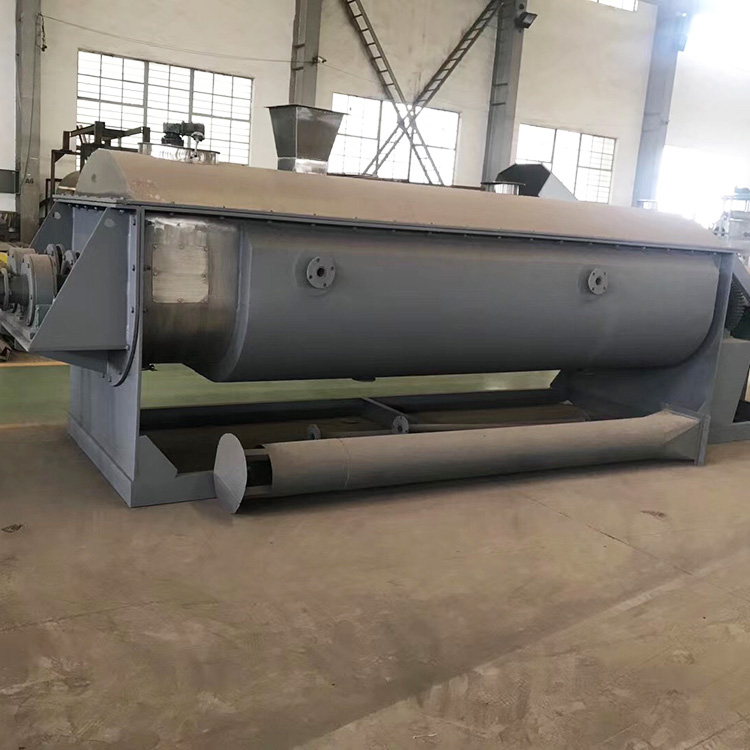 空心軸上密集排列著楔型中空漿葉,熱介質(zhì)經(jīng)空心軸流經(jīng)漿葉。單位有效容積內(nèi)傳熱面積廣,熱介質(zhì)溫度從-40℃到320℃,可以是水蒸汽,也可以是液體型:如熱水、導(dǎo)熱油等。間接傳導(dǎo)加熱,沒有攜帶空氣帶走熱量,熱量均用來加熱物料。熱量損失僅為通過器體保溫層向環(huán)境的散熱。楔型漿葉傳熱面具有自清潔功能。物料顆粒與楔型面的相對運動產(chǎn)生洗刷作用,能夠洗刷掉楔型面上附著物料,使運轉(zhuǎn)中一直保持著清潔的傳熱面。漿葉干燥機的殼體為Ω型,殼體內(nèi)一般安排二到四根空心攪拌軸。殼體有密封端蓋與上蓋,防止物料粉塵外泄而充分發(fā)揮作用。