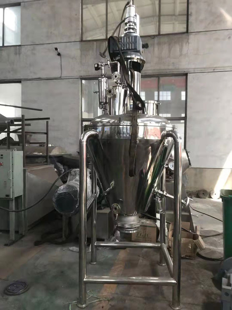 1.單錐真空混合干燥機中的物料在容器內(nèi)受熱是緊貼容器內(nèi)壁,由螺旋槳葉自下而上旋轉(zhuǎn)至容器上部,然后沿主軸呈渦流向下。物料在整個干燥過程中始終在分散運動。物料的運動狀態(tài)保證了物料的均衡受熱。