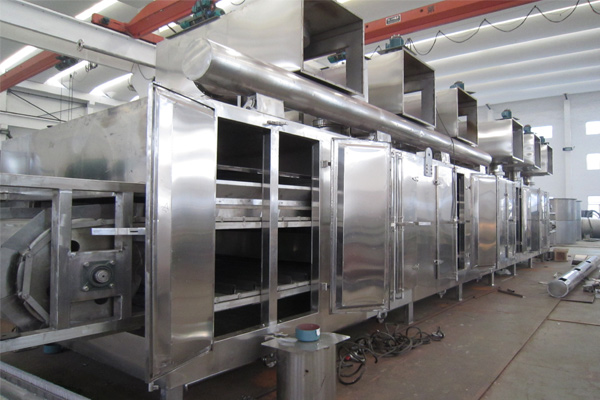 物料由加料器均勻地鋪在網(wǎng)帶上,網(wǎng)帶一般采用12-60目不銹鋼絲網(wǎng),由傳動(dòng)裝置拖動(dòng)在干燥機(jī)內(nèi)移動(dòng)。干燥機(jī)由若干單元組成,每一單元熱風(fēng)獨(dú)立循環(huán),部分尾氣由專門排濕風(fēng)機(jī)排出,廢氣由調(diào)節(jié)閥控制,熱氣由下往上或由上往下穿過鋪滿物料的網(wǎng)帶完成熱量與質(zhì)量傳遞的進(jìn)程,帶走物料水份。網(wǎng)帶緩慢移動(dòng),運(yùn)行速度可根據(jù)物料溫度自由調(diào)節(jié),干燥后的成品連續(xù)落入收料器中。上下循環(huán)單元根據(jù)用戶需要可靈活配備,單元數(shù)量亦可根據(jù)需要選取。