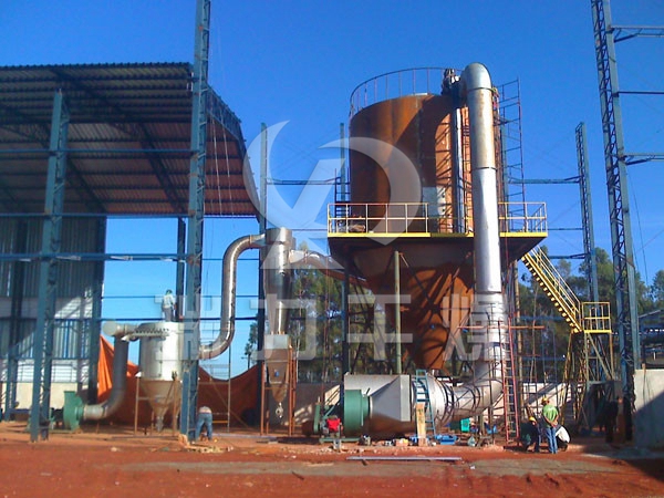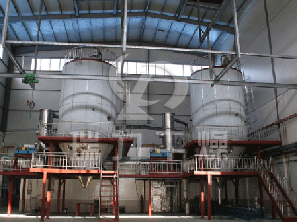 空氣經(jīng)過濾和加熱,進入干燥器頂部空氣分配器,熱空氣呈螺旋狀均勻地進入干燥室。料液經(jīng)塔體頂部的高速離心霧化器,(旋轉(zhuǎn))噴霧成極細微的霧狀液珠,與熱空氣并流接觸在極短的時間內(nèi)可干燥為成品。成品連續(xù)地由干燥塔底部和旋風分離器中輸出,廢氣由風機排空。