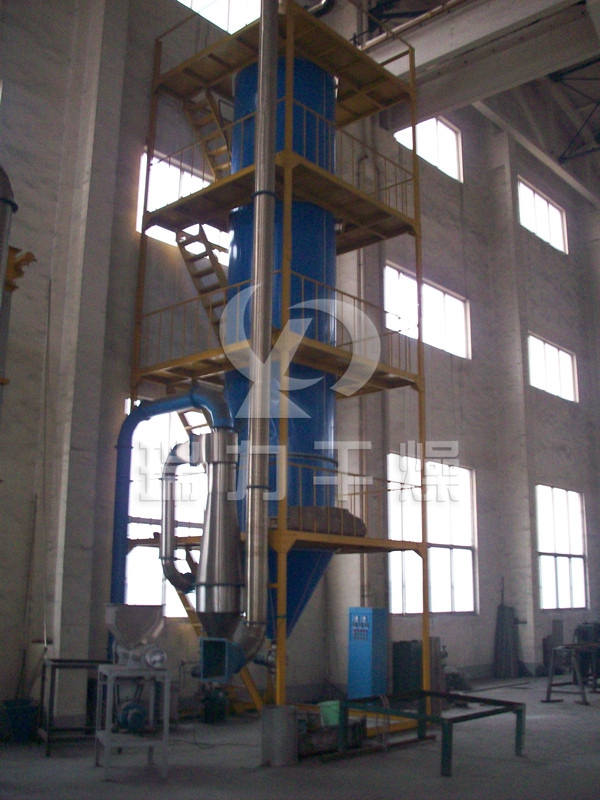 工作時(shí)物料液通過(guò)隔膜泵高壓輸入,噴出霧狀液滴,然后同熱空氣并流下降,大部分粉粒由塔底排料口收集,廢氣及其微小粉末經(jīng)旋風(fēng)分離器分離,廢氣由抽風(fēng)機(jī)排出,粉末由設(shè)在旋風(fēng)分離器下端的授粉筒收集,風(fēng)機(jī)出口還可裝備二級(jí)除塵裝置,回收率在96-98%以上。